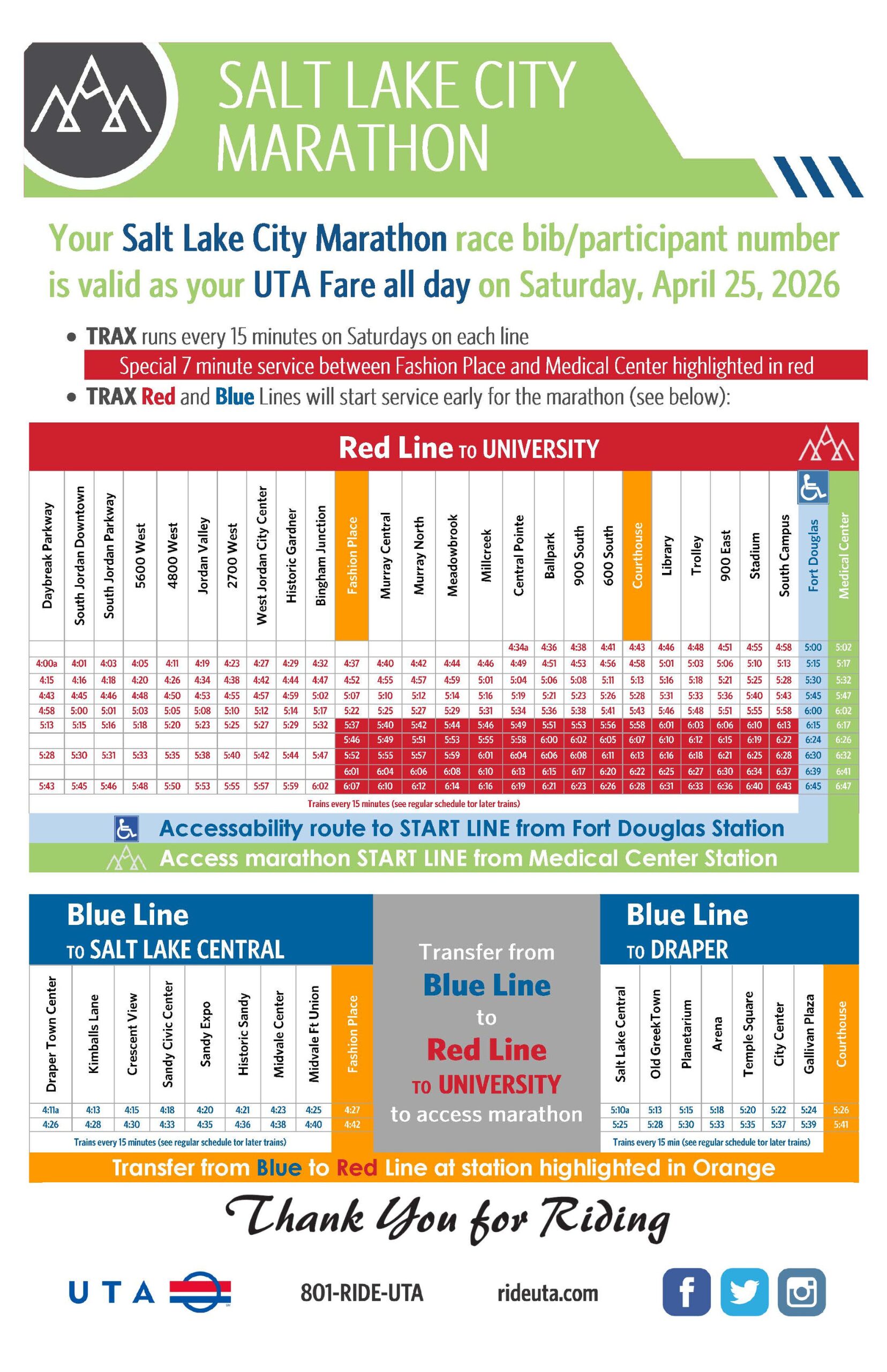 Your race bib is valid as UTA fare on TRAX, FrontRunner and regular UTA buses for the full day on Saturday, April 26, 2025. Free parking is available at all TRAX stations south of Ballpark Station (including Ballpark Station). You can also park in one of the 9,000+ paid parking places that are closer to downtown ($3-10 for the morning on average) and travel up to the University of Utah to start via the RED or BLUE line on TRAX. TRAX and UTA, our invaluable partners in providing exceptional service to our race participants, will add extra train cars on race day to increase capacity.